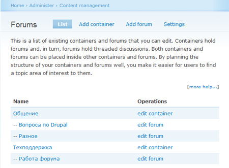 Давайте создадим пару контейнеров и один-два форума для каждого (для контейнеров выбираем родителем root, а для форумов – контейнеры). Как и обычные термины, форумы и контейнеры могут организовываться по весу. Контейнеры и форумы можно поместить в другие контейнеры и форумы, но злоупотреблять этим не стоит: более плоская структура удобнее для пользователей. После создания контейнеров и форумов страница управления форумами будет выглядить примерно так: