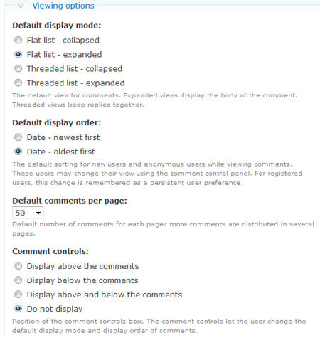 Комментарии настраиваются в Administer-Content management, вкладка Settings. Вспоминаем нашу задачу: ленточный форум с показов всех сообщений в хронологическом порядке (от самых старых к самым новым).