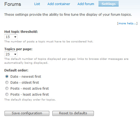Теперь зайдите в настройки форума (settings) – вкладка на странице администрации форумов. Это управление вывода списка тем в форумах. Здесь можно установить количество сообщений для того, чтобы тема считалась «горячей» (то есть специально обозначалась), сколько тем выводить на страницу и порядок вывода тем. По умолчанию Date – newest first (чем новее, тем выше в списке тем), что нам и нужно. Пока что можно оставить дефолтные настройки.