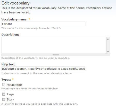 Если вы теперь зайдете в управление категориями, там будет словарь Forums со всеми созданными нами контейнерами и форумами. Если вы попробуете отредактировать словарь форумов (edit vocabulary), вам тут же сообщат, что это специальный словарь для форумов и некоторые типичные опции словарей были убраны. И действительно, у вас не будет возможности сделать множественную иерархию терминов или убрать тему форума из прикрепленных в данному словарю типов контента. Здесь можно добавить Help text – инструкции, которые будут показываться пользователю при создании темы форума, а больше ничего трогать. Форумы и контейнеры нужно создавать на странице управления форумами, поскольку здесь вам даже не дадут выбрать между ними.