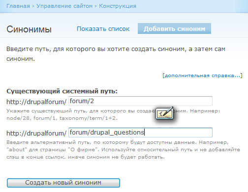 Зайдите на страницу форумов и запомните путь у форума или контейнера, который вы хотите поменять. После этого зайдите в Administer-Site building-URL aliases (Управление сайтом-Конструкция-Синонимы) и выберите вкладку «Добавить синоним» (Add alias). Введите существующий системный путь и его синоним, который будет показываться пользователю. Создайте синоним.