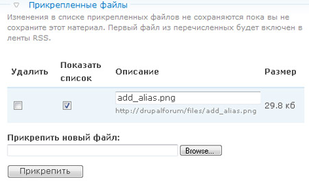 Модуль upload позволяет прикреплять файлы к материалам, включая изображения. После включения модуля в форме создания/редактирования материала появляется опция File attachments (Прикрепленные файлы).