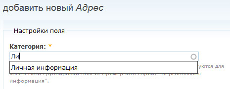 Создадим еще одно поле в этой категории, например, для вебсайта. Выберите поле URL, заполните категорию. В Drupal’e существует автоматическое заполнение категорий профилей с помощью технологии Ajax. Если категория уже существует, можно набрать первую пару букв и подождать, пока она появится в списке. Это удобно, если вы хотите избежать опечаток и убедиться, что категория одна и та же.