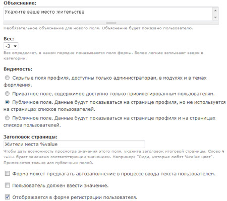 Можно добавить объяснение, которое будет показываться пользователю при заполнении поля («Например, укажите ваше место жительства»), вес поля (чем выше, тем раньше будет показываться поле в этой категории) и видимость (третья опция, показ поля на странице учетной записи, но не в списке пользователей). В заголовок страницы можно ввести «Жители места %value», если мы хотим, чтобы можно было просматривать список пользователей с одинаковым значением этого поля. Мы не хотим делать это поле обязательным, но хотим, чтобы оно появилось в форме регистрации пользователя.