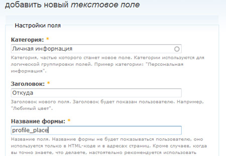 Выберем текстовое поле, введем название категории (Например, «Личная информация»), заголовок поля («Откуда») и служебное название поле по-английски, без пробелов и специальных символов (profile_place).