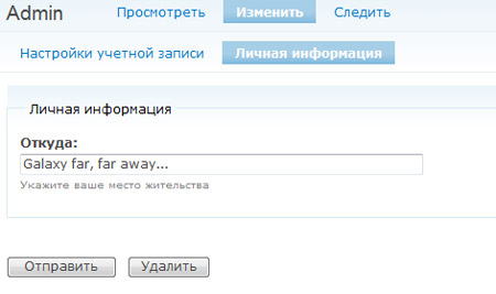 О собеседниках часто хочется узнать побольше. В этом вам поможет модуль profile, позволяющий гибкую настройку учетных записей пользователей. Зайдем на страницу Administer-User management-Profiles (Управление сайтом-Пользователи-Поля профилей). Здесь вы можете создать новые поля для учетных записей пользователей. Например, создадим поле для места жительства.