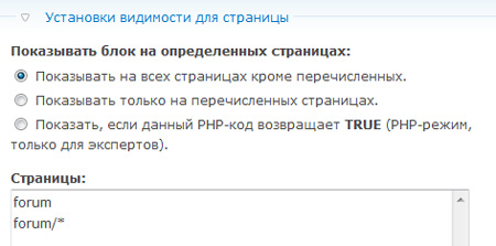 По желанию можно указать, что они должны показывать только на главной странице и по адресу forum и forum/*.