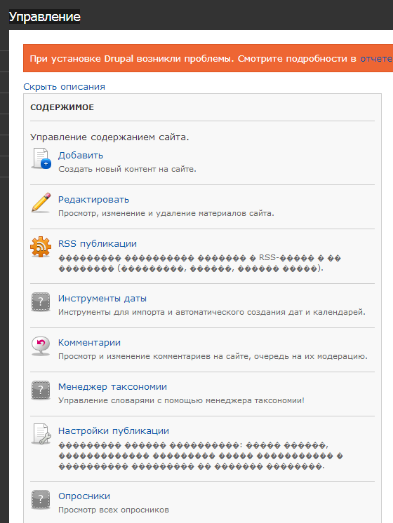 Когда произошло не знаю, так увидел сегодня в первые , зашел site.ru/admin и увидел в разделе "Управление" в некоторых категориях (описание) в черных ромбиках с вопросиками. Drupal 6.29 . Экспортировал языковый файл, нашел этот текст, все в норме, кодировку пере сохранил повторно в utf8 (без BOM) , изминений ни каких. пробовал в файле убирать вообще текст, но ромбики по прежнему отображаются, хотя пробовал менять сам заголовок в этом файле, он изменяется. Подскажите где искать проблему?