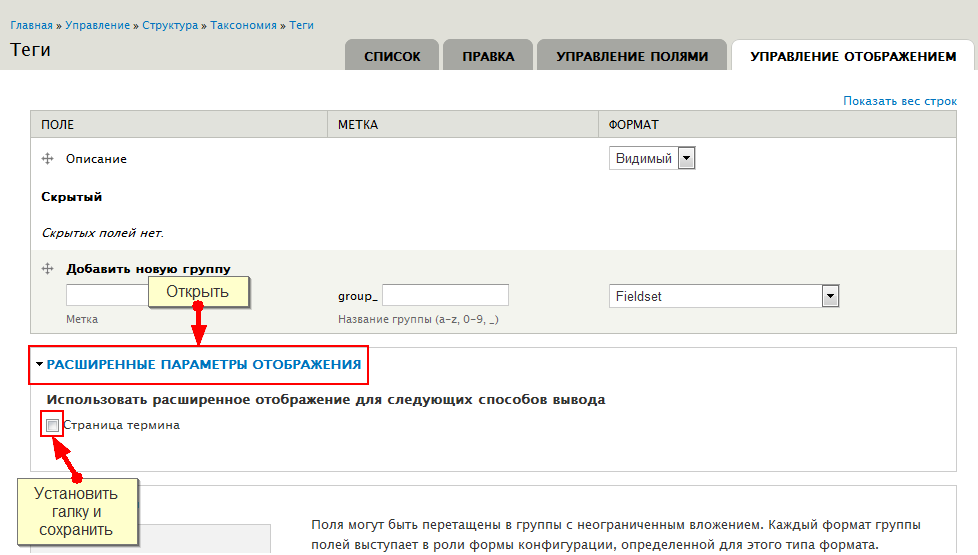 Почему у меня при открытии Таксономия - Управление отображением нет кнопки Страница термина в правом верхнем углу и нет Term page display в параметрах слева..