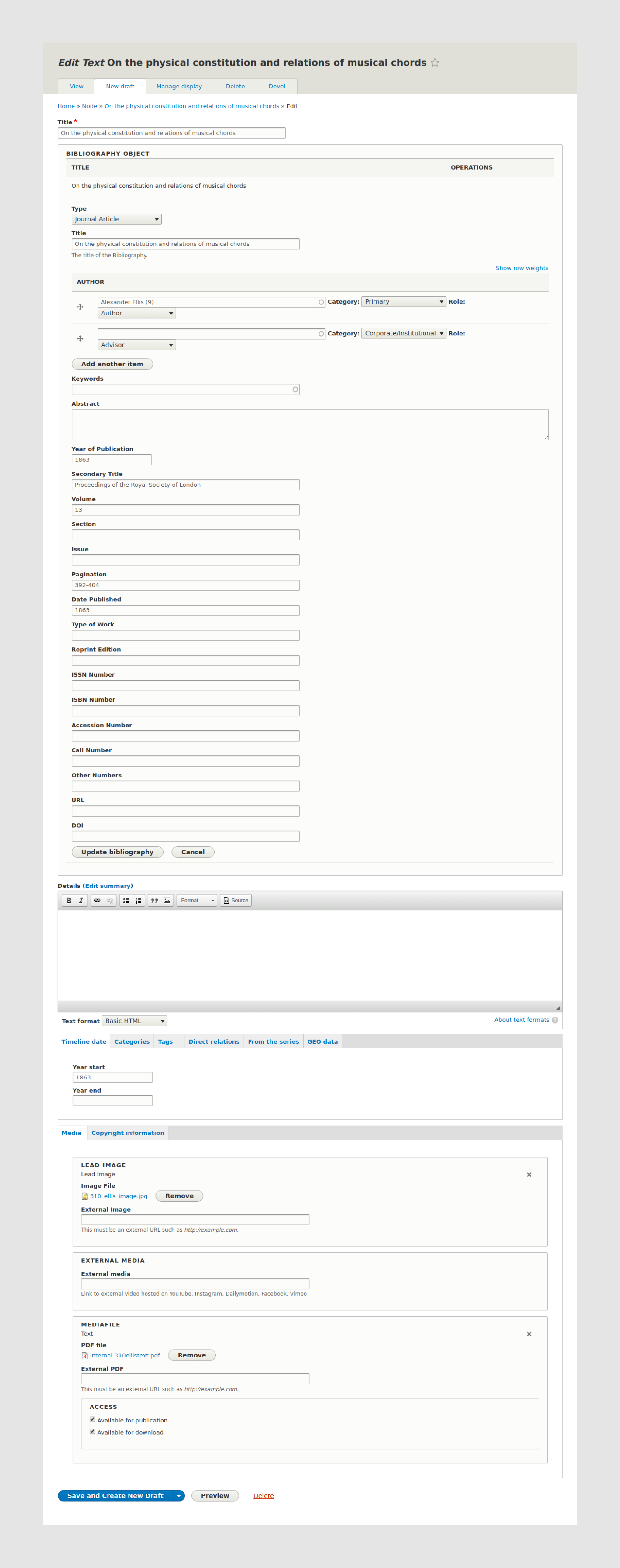 Библиографические данные хранятся в сущностях Reference, Contributor и Keyword. За хранение данных отвечает модуль Bibliography & Citation — Entity. Обращаем внимание, что библиографические данные отделены от контента, но в определённых случаях они могут легко ссылаться друг на друга с помощью поля Entity Reference.